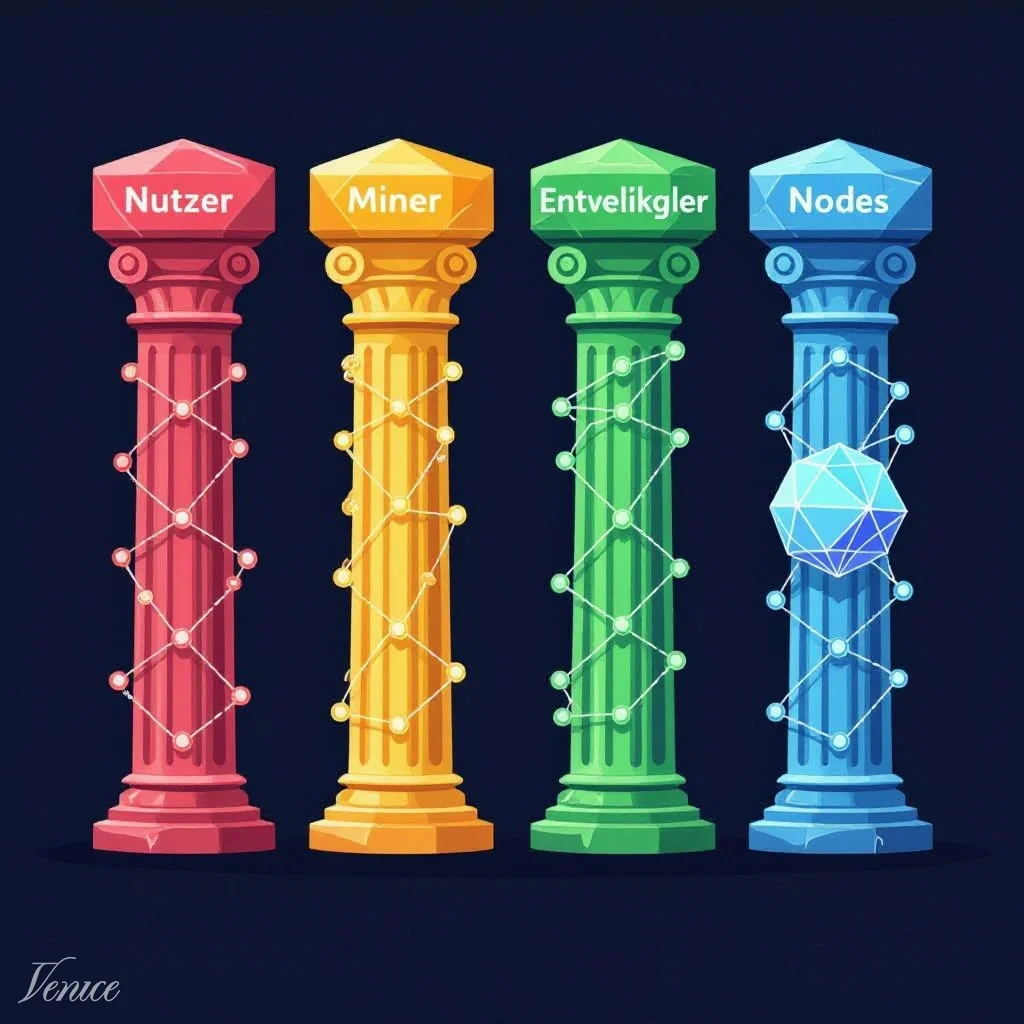 Im Folgenden werden die vier zentralen Rollen im Bitcoin-Netzwerk – Nodes, Miner, Nutzer und Entwickler – vorgestellt. Jede Rolle hat spezifische Aufgaben, trägt zur Stabilität des Netzwerks bei und kann allein keine vollständige Kontrolle über das System erlangen.